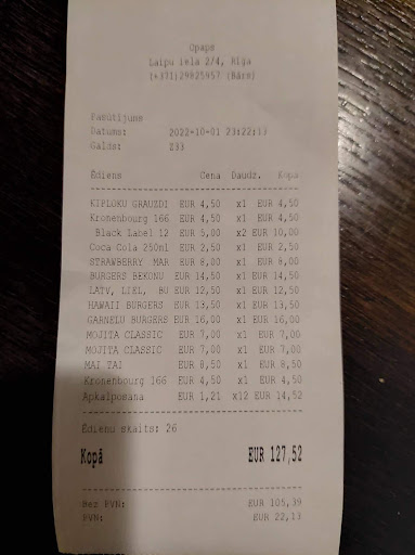 I would divide my rating in two sections: one for food(5 stars) and one for O'paps fee policy (0 stars). The food there was really good. Quality and price ratio is very fair. They make amazing burgers and mojitos. We enjoyed the place and food very much, until check came. There were no explanation about service fee. We didn't saw anything about it on meniu, and none of waitress es explained about fee before ordering food, check delivery. We were shocked by the hidden fee, but we payed it anyway. When we came to find out why they charged us that much, the waitress said, that this is their fee policy, and they charge 10% or more percents from every individual order. So be careful, and always ask about restaurant fee policy, because we really liked this place, but also we...
