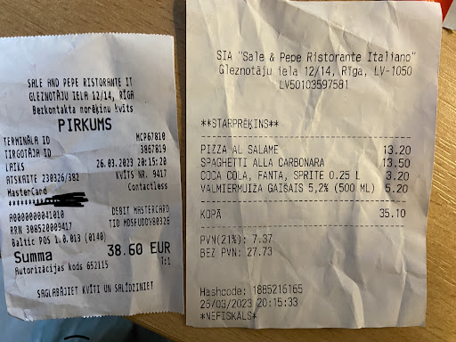 Part of my family lives in Italy. I travel back and forth quite often. I absolutely love Italian cuisine and I can say I've tasted many pizzas in different places throughout Italy and Latvia. This place has the MOST authentic Italian pizzas in Riga. This is the closest you can get to those served in Italy. Both taste-wise, look, and feel-wise. Besides, often pizzas that you get in Italy are actually worse than these served in Sale&Pepe. I can say for sure I haven't found a better pizza in a single tourist area in Italy (Lago di Garda, Venezia, Milano, Cinque Terre, etc).