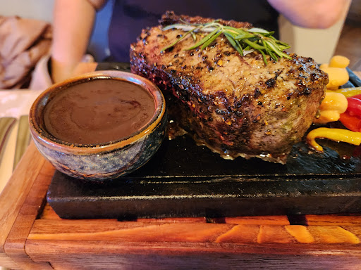 I can't believe we have waited so long to try this restaurant. This place has become one of our instant favorites after just one meal here. The outdoor eating area is a great place for a meal, but if you would like a more quiet upscale atmosphere, simply look at getting a table for two or a large group inside. The service here was great. Our waiter was beyond busy, but still made time for everyone he was serving. I had a Medium Rare Beer Steak - absolutely delicious and cooked perfectly. My wife had the Striploin. Word for the wise, it is a big steak hahahaha. The steak came out on a very hot cast iron slab on a solid wood block. This kept the steak hot the entire meal and could even be used to further cook steak slices. I really enjoyed the side of the hot peppers, but maybe a little too hot for my wife. In the end, we made our way through the steaks...barely hahaha. It was an amazing meal. Thanks. We'll...