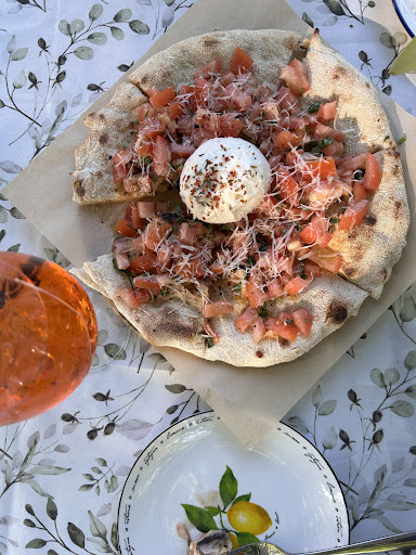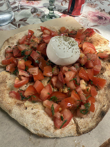 Otra pica ar burratu diemžēl bija vilšanās – iespējams, sliktākā burratas pica, ko esam ēduši. Kā parasti, burrata pati par sevi ir garšīga, un arī mīkla glāba situāciju, taču – tomāti bija zaļi, sagriezti lielos gabalos, kas krita nost, nebija ne rukolas, ne līdzsvara garšā vai izskatā. Nevienam negaršoja.