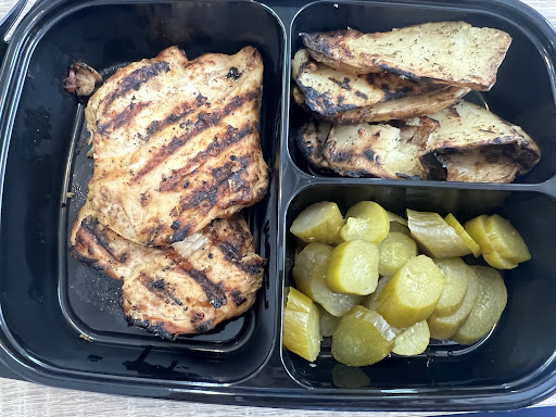 The platter is served with a generous quantity of pickles even though it was not stated in the menu, hummus, slices of grilled potato and a side salad.