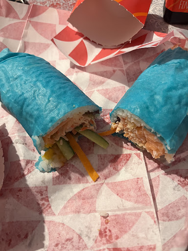 The burrito ingredients were fresh and tasty and the teriyaki sauce on the side really brought it all together. I wasn’t a huge fan of the blue wrap itself. It had a slightly sweet, papery taste.