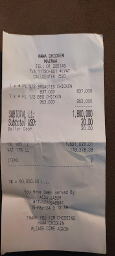 Read moreUnfortunately last time ill be eating there !! Ordered 2 meals * half grilled chicken * half broasted chicken First of all we waited 15 min to get served the grilled chicken came almost cold and not fresh at all + the fried potatoes too much oily and cold in which the quality wasn't good enough....for the second meal the big surprise! Chicken still raw uncooked with a stinky smell we were so disappointed with this food quality. I told the manager there he tried to explain for me that I'm wrong and everything is alright??I'll never be back there or order from all hawa chicken branches for good and do not recommend anyone to eat broasted...
