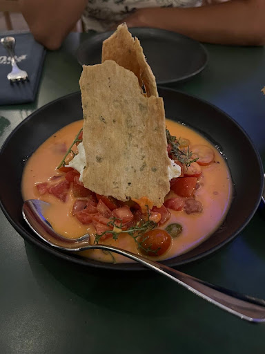 Among the dishes, the salads stood out. The tomato salad, topped with tomato ice cream, was both original and delicious. The potatoes were also well done and enjoyable.