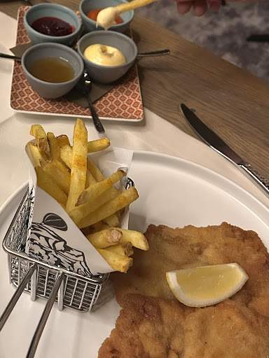 Das Restaurant wirbt für die Verwendung lokaler Zutaten und das stimmt. Die Speisekarte ist jedoch ziemlich traditionell: Schnitzel, Kürbissuppe, Eis zum Nachtisch und natürlich der Grundnahrungsmittel der Hotellobby: ein Hamburger, serviert auf einem Stück Sperrholz.