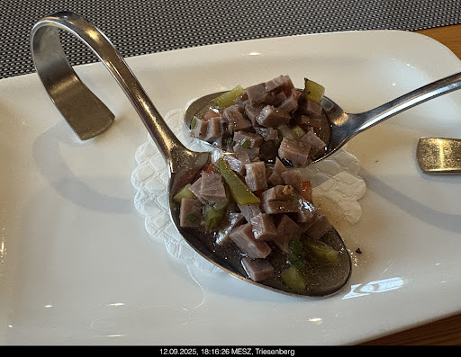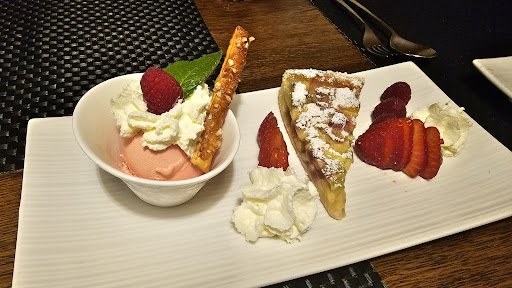My wife got pork in cream sauce with noodles, I got breaded pork (aka schnitzel). Both pork dishes were fine. But, three things about the meal were outstanding: amuse bouche! Huh? we sure were not expecting that, but a spectacular gorgonzola ravioli was served to each table on a spoon so that it was easy to eat. Very very good and a completely unexpected surprise. Fries with the Schnitzel were superb and the noodles with the cream sauce were outstanding.