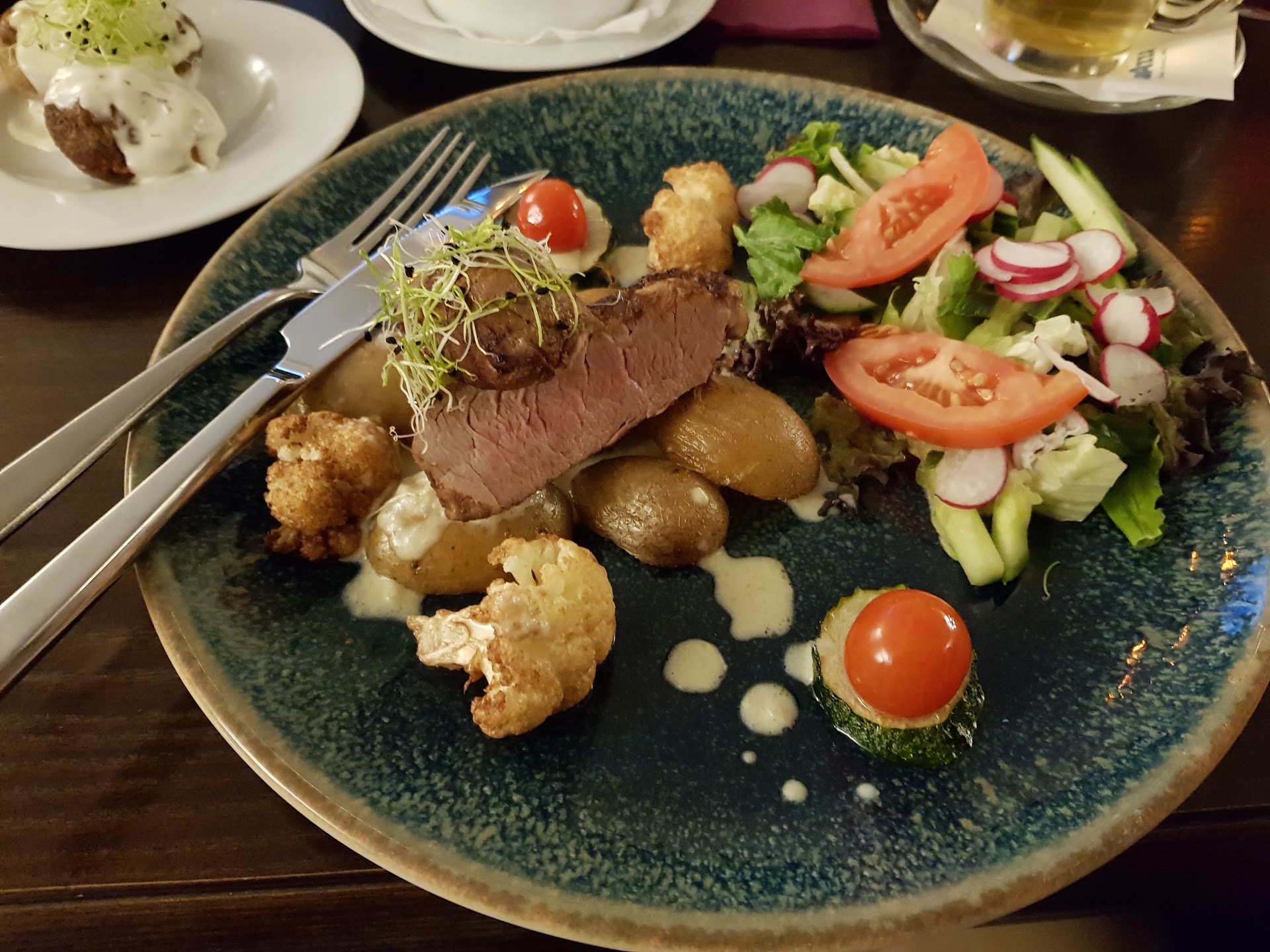 Read moreVakar vakare 2024/04/30 atėjome vakarienės su draugu ir likome labai nusivylę. Atvykus niekam netupėjo 10 minučiu kol pats nepaprašiau Menu. Gavus Menu priėjo dar po 20min priimti užsakyma. Nu ok, matau kad busy viską suprantu. Užsisakau gazuoto vandens, šviežiai spaustu apelsinų-obuolių sulčių, lašišos tartara ir steika (aiškiai kelis kartus pasakau MEDIUM RARE, padavėja užsirašo). Draugas užsisakė Capuccino (tai buvo mažiausiai į tai panašu), limonado su passionfruit ir štrudelį. Gėrimai atkeliavo maždaug po 15-20 min, visi iškyrus mano sultis. Nu bet galvoju gerai užtrunka išspaust nes busy. Tada maistas. Mano tartaras ir steikas ateina vienu metu. Nu ok tipo taip db. Nesiskundžiu nes labai noriu valgyti. Pamaniau dar geriau nes nereiks laukti steiko. Tartarui beveik priekaistu neturiu, buvo gan skanu. Steiko eilė. Prapjaunu. Perkeptas. Nu galvoju pabandysiu. Dedu į burna draugas mato mano veida klausia kaip. Sakau lb blogai sausas ir perkeptas. Pasikviečiu vadybininkę Monika. Pirmiausiai paklausiu kur mano sultys nes jau 40 min praėjo. Ji nusijuokė ir sako sulčiu mes nedarome šiandiena. Klausiu kaip? Kodėl man tai sakote po 40 minučių, ji atsiprašo nu nedaro tai nedaro. Aišku reiktų informuoti klientui užsisakius. Steikas, jis perkeptas sakau Monikai. Ji man atsako, kad ne. (ikeliu foto kaip atrodė steikas ir kaip jis turėtų atrodyti). Aš sakau taip čia Medium Well o ne medium rare. Ji jau pikta man pakeltu balsu sako kad pas juos yra taip. Mintyse galvoju kad man nesvarbu kaip pas juos yra, mesos kepimo standartas visur vienodas. Sakau aš jo nevalgysiu. Ji šypsosi. Vyksta ginčas. Noriu nufotografuoti, ji griebia steika nuo stalo ir bėga, sakau palaukite leiskite man nugotografuoti. Sako KAM TAU REIKIA. Jau mane tujina. Nu puikiai vadovauja restoranui. Ikalbu kad leistu. Leidzia. Sako parodyk nuotrauka. Wow galvoju kodel aš privalau rodyti kažka. Čia aš klientas ar Monika. Nu okay, parodau. Sako yra rausvo. Sakau yra bet cia medium well ne medium rare. Dar viso pokalbio metu ji man vis sake kad taip atrodo medium. Bet as ir medium neužsisakiau. Uzsisakiau MEDIUM RARE. Ji tiesiog nueina. Be nieko. Jokio atsiprašau. Jokio pasiulymo iskepti kita. Lieku nesuprates gausiu kita ar ne. Ar jau teikia eiti maisto ieskoti kitur. Buvau pastatytas i labai keista situacija kur ant manes šaukia ir bando kazka irodyti vietoj to kad tiesiog atsiprasytu. Neesu to patyres. Rankos dreba. Kalbam su draugu kas cia buvo ir kodel ji taip sau leidzia elgtis. Monika daugiau niekada nepriejo. Papraseme saskaitos. Sakaitoj nebuvo nei steiko nei sulciu. Susimokame. Nerekomenduoju!!!! Vadovam rekomenduoju pasikalbeti su Monika, nes gal ji tiesiog negali dirbti sio darbo. Bivo...