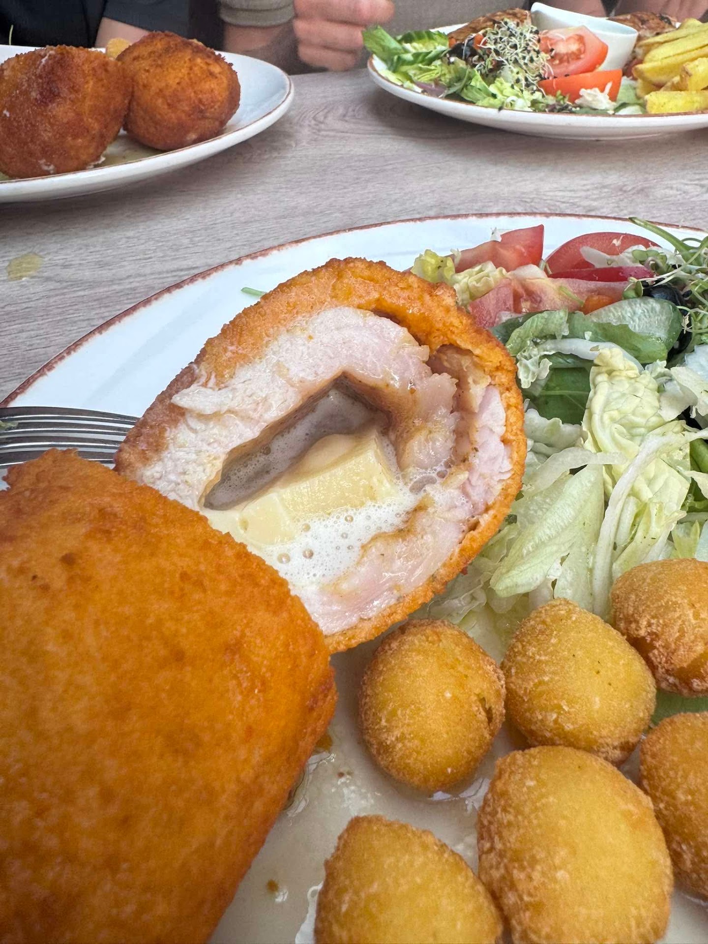 We ordered these cheese fingers which we're really good although heavy as an appetizer for two. The accomodating sauce was quite tasty. For our main course she ordered baked chicken and I had the grilled vegetables. Both of us enjoyed our meals. The portions were quite large, and so at the end we took our remains with us. The food was good but missed some final touches or something special.