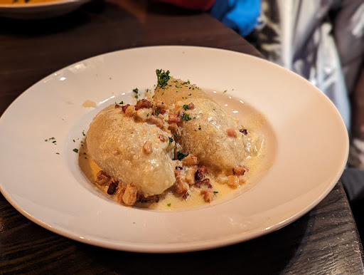 As a starter they serve some fried bread with a creamy dip which tastes very well. The fried smoked cheese is a bit chewy outside and creamy inside with a taste reminding of Scamorza. The potato pancakes are soft and taste like they do in other countries like Germany where they are common as well. It would be great if they have more crust outside so the texture is more appealing. The Zeppeline has been a highlight. It is rich in flavour. The salt level has been on point.