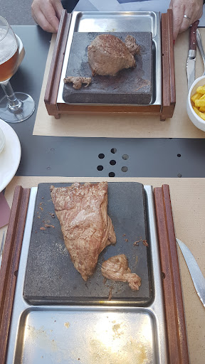 Wir hatten ein Filet von 200 g auf dem Stein und ein Peter’s number 1 von 400g vom Grill. Das Filet war ok, wobei man hier nicht viel falsch machen kann, wenn es denn auch wirklich Filet ist. Dazu gab es eine Ofenkartoffel, einen kleinen gemischten Salat und 3 Saucen. Bei Letzteren waren 2 auf Mayonnaise-Basis, eine Aïoli und die andere irgendwas mit Kräutern (?), sowie ein Stück Kräuterbutter. Das Peter’s number 1 war allerdings zäh was nicht unbedingt erstaunlich ist, weil es mit der Faser geschnitten wurde. Entweder die haben einen unwissenden (oder schlechten) Koch oder Metzger. Es ist auch nicht ersichtlich warum das, laut Karte, nur blutig geht! Dazu gab es ein halbes Dutzend Erbsen die nach nix geschmeckt haben, ein Stück gebratene Tomate und Pommes. Einen gemischten Salat gab es nur gegen Aufpreis. Tiramisu und Crème brûlée waren gut aber nicht besser als anderswo. Der Service war zum Teil mehr als zügig. Das Abräumen begann schon obwohl ich noch am essen war. Wirklich interessieren tut die Antwort auf « hat es geschmeckt » dann wohl auch nicht, sondern ist nur eine abgespulte Frage. Ach ja: was das « amuse-bouche » eigentlich war - hat man uns nicht gesagt - irgendwas frittiertes mit irgendeiner Füllung. Alles in allem war es die insgesamt fast 100€ nicht wert. In der Nähe gibt es eine wesentlich...
