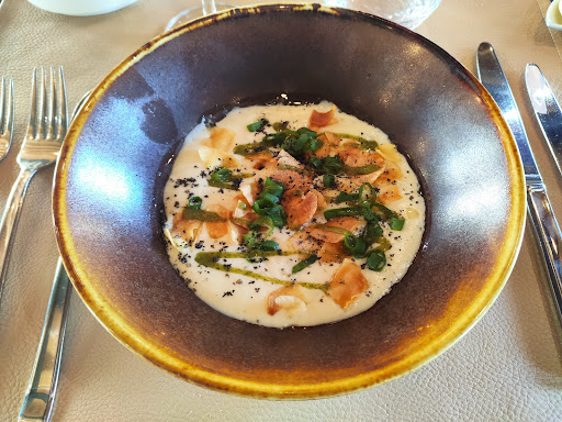 We went there for a special occasion and we were a bit disappointed by how we were rushed by the staff. We were asked if we wanted to take the apero on the terrace, to which we replied yes. After ordering it and receiving it, each 5-7 minutes someone was coming to ask if we are ready for the food order. We gave it, then we were announced that we should go to the table, that the first dish should be served soon - mind you, not everyone at the table had the drink finished. We went inside, had our dishes, which felt rushed one after the other. No explanation was given in terms of the wines chosen for each plate, not much explanation for the dishes either. When going to a restaurant that has quite a name in the south of Luxembourg, you expect something else in terms of service - at least to give you the peace of mind to enjoy dinner with friends, not to feel rushed by all the waiters. The food was very good, but for the overall atmosphere we...