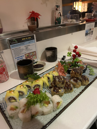 We tried sushi train. Kids over 10 are considered “Adults” and we paid 27 for our 11 year old. When I asked, the waiter was so direct in her communication and shut me down, no smile. Communication was overall terrible. For 30min there was nothing but maki turning. I think they should stop train but serve only on tables rather than us waiting like beggars with our money. Mediocre food, very thin fish slice on sushis. They fry gyoza and all hot dishes were fried. Miso soup and chinese soup were not tasty at all. Smoked salmon nigiri was the only thing I really liked. For desert, there was no fresh fruit, all canned, ananas, mango (or peach i don’t know) and lichi. In other places they offer fresh ananas or melon, for example Mont Fuji, in the same...