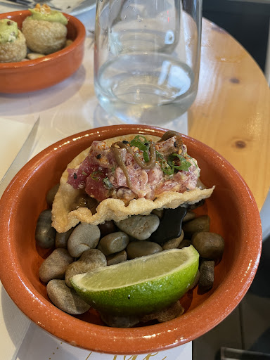 We got to know about the concept (food cooked with love, just like a mother does) and the changing menu. We picked the tuna tacos and the pani puri for starters, as well as the prawn rice with fish on top for mains. For drinks we picked the sangria and the cucumber sour.