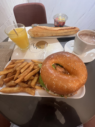 Dégustation: Le « Bagel » était globalement délicieux. Par contre, j’aurais choisi du guacamole à la place des tranches solides d’avocat car avec le « Bagel », pain plutôt dense et froid, il y avait un conflit de saveur, 2 éléments solides qui rendaient la dégustation moins harmonieuse. De plus, les tranches d’avocat ont été répartie de manière hétérogène au sein de la tranche de section. En effet, si l’on considère le « Bagel » comme une horloge, les tranches d’avocat se situaient uniquement de à 7 à 9h, ce qui n’est pas le cas du saumon, du fromage, des concombres et de la salade qui ont été répartie équitablement sur toute la tranche de section. Les frites étaient croustillantes. J’ai particulièrement bien aimé la confiture de la marque « l’Atelier de Philomène », belle découverte. Les fruits servis étaient frais. Je conseille simplement d’en faire un « yaourt aux fruits » pour l’onctuosité et pour diminuer leur sécheresse. Le jus d’oranges pressées était super frais.