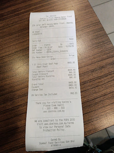 The best part about this is when I arrived home and gave the pizzas to my family, I got the wrong order. I specifically told the cashier I wanted the two pizzas to be beef pepperoni and BBQ chicken and both pizzas to be thin crusted. I received two boxes of beef pepperoni, not thin crusted, with limited amount of pepperonis on the pizzas. To give you a visual of this, one slice had only one piece of pepperoni. It was diabolical. I felt so angry but my family was hungry so they were left with no choice to just eat the pizzas. This branch is very bad and I would suggest the manager take action on your staffs. We are not receiving the pizzas for free, we are...