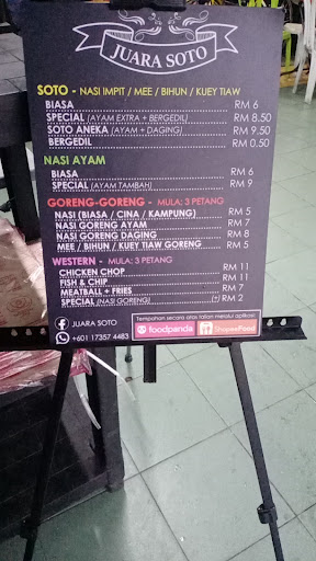 Read moreJangan lupa datang dan cuba makanan di kedai ni. Ada pelbagai menu untuk dicuba. Semua menu setakat ni... tidak mengecewakan. Menu nasi goreng daging ni memang patut dicuba. Nasi goreng yang dimasak dan digoreng hanya bila kita order... daging digoreng panas- panas. Rasa yang sangat sedap bila dicampur bersama sup kosong dan black pepper sos! Pasti teringat untuk kembali dan merasai nasi goreng daging ni. Kedai ini juga menghidangkan soto dan mee/mihun sup. Ini adalah trademark kedai sepertimana namanya JUARA SOTO! Soto disini juga menjadi kegemaran ramai. Tidak lupa juga makanan barat seperti chicken chop dan meatball juga. Semua menu ini cukup untuk memenuhi selera...