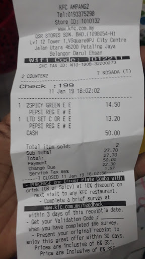 Had a delivery order from this outlet via Foodpanda around 11:30am. (KFC, if you bother paying attention to these reviews, the SST is W10-1808-31001268). Anyway, the food arrived fast, but the chicken arrived cold. I noticed it almost immediately when the delivery guy handed the plastic bag over to me - there was no warmth coming from the box of chicken. Sure enough, I opened to box to find cold chicken - did someone forget to put the chicken under the warmer? Or did they take this batch of chicken that's been lying on the counter somewhere.