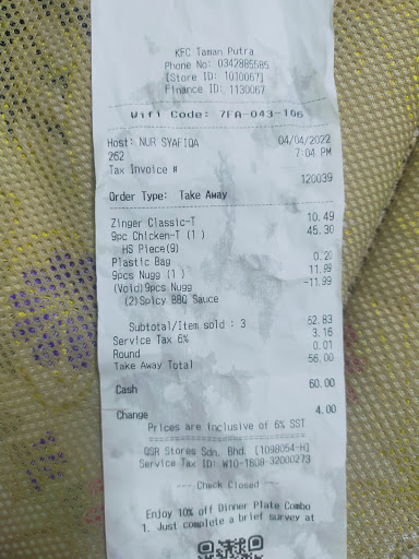 Read more7.04pm April 4th, 2022. Taman Putra KFC served unfresh and rotten fried chickens. Ordered 9 pieces of ala-carte fried chickens and a Zinger Burger, from this KFC outlet in Taman Putra. Took back home for family members' consumption. All my family members said and complain all the fried chickens were not fresh, rotten and very very salty (to mask the unfresh meat)...anyone who is having the same experience pls voice out...consumers are paying a hefty amount in return for rotten chickens. No joke. Still got leftover chicken meat. What happened to the food quality of this well known...