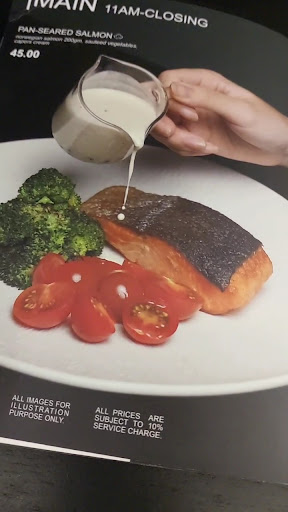 Salmon SOSO GOOD, tender, juicy, perfectly cooked and still moist on the inside with crispy skin like a crust. Cutleries are good too! The salmon is pink and orange and tasted fresh. Sauce could be thinner but I mean, itâs perfect! The portion is extremely generous, I struggled to finish but shared to finish it.