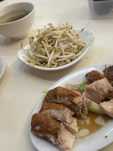 I had a quarter chicken (white chicken), small bean sprouts, small rice, an herbal tea (liang cha), and a small plate of chicken innards.