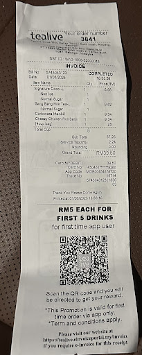 Read morePlease kalau nak tealive pergi lah jauh sikit dari sini paling paling kat spectrum ampang tu. tealive sini. Minta smoothie ais nya yang lebih.. tak hancur sgt pulak tu tak memasal kena kunyah ais. Air nye tak rasa pun strawberry rasa aisssss ajaa😭. Order signature coco pulak.. air coco nya pulak yang banyak ais nye tak banyak😭 also staff dia tak friendly takut lah nak tanya balik pasal air🥹, cuma nak cakap takyah lah eh beli...