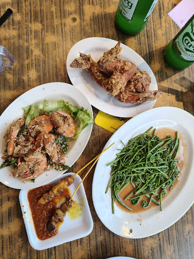 Went there for dinner with three people, and the restaurant was always packed with many tables reserved. Luckily, we managed to get a table before 7:30 PM. We ordered their famous fried chicken, which lived up to its reputation. The Midin vegetables were delicious but quite pricey. The satay was decent, and the Stingray Bakar was good with no unpleasant smell.