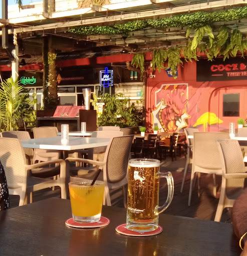 This bar is located on the Waterfront (2nd shop from the left if you are facing the sea). Nice bright red wall painting of a cock and bull. Can't miss it. Waiters (guys and girls) we always available and gave us fast service, Sono complaints there. We could discuss with them and improvise our menu. On the view, can't say much for it wld be the same anywhere along this beach And along the the Waterfront. BUT the seating layout here doesn't allow THOSe tourist to stand at the railing to film the entire sunset . You have to get a table and once u have a table at the railing they can't block you. Which is great and not like other bars in this area.