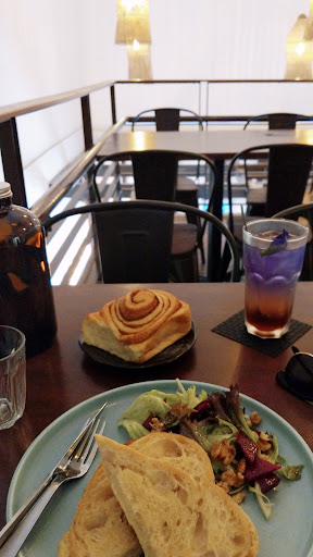 I ordered one of their set menu which comes with: grilled cheese sandwich, blue pea lemonade, and custard tart (which as I'm typing this, I just realised they've forgotten about the custard tart). The set cost RM20, and I got an extra cinnamon roll on the side for an additional rm5.