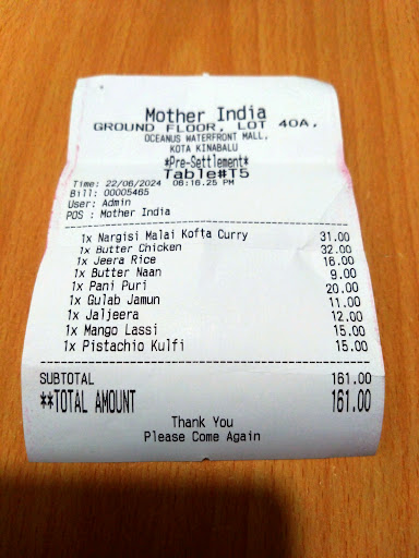 Read moreI normally don't leave reviews but the very mixed experience I had dining here last night is still with me. I spent quite some time researching a nice spot with vegetarian options and was in a very positive mood coming to Mother of India at sunset. The (not-so-gentle)man who came to serve me seemed bothered by my presence. Perhaps I was a bit too cheerful? I gave him the benefit of the doubt. Perhaps he was having a bad day, personal issues, who knows. I tried to joke with him a bit but every exchange was met with one-word answers and zero warmth. Now I was starting to feel like he just didn't like people, or perhaps tourists, even polite ones. I don't like to assume, however, and decided not to let him bother me. The food, on the other hand, was excellent (mango lassi, papadams with mint sauce, chana masala, hot and plentiful garlic naan). I finished this delicious meal and went to pay. I didn't see a restroom sign in the restaurant and said to him that I guess they were in the mall that the restaurant is in. To my shock, he treated me like a pest he wanted to shoo out the door, saying very rudely "Yeah yeah, go" and motioned to the back door with his chin. Now this was too much. It was a truly degrading feeling that erased what would have been a lovely dining experience. I have yet to meet a ruder person in all of Borneo. If you're having a bad time and have to come to work, please try to see the light in people. And if you don't like people, please don't work in the service industry, as your contempt surely...