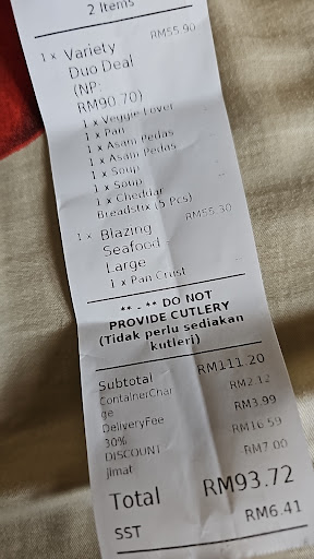 Read moreOrder the largest Blazing seafood pizza for sure to get loads of toppings...loved it. I also enjoy their simple asam pedas pasta..they cant beat other pizza places but they are getting better especially when they throw in lots of value deals regularly when others dont. Vegetarian pizza if u get the thin & crispy ones are better but in deals..pan ones are just as good....