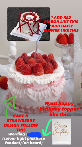 The strawberries on top, especially the ones highlighted in the blue circle, were uneven in shape and did not look fresh or presentable. The staff was recommended a âHappy Birthdayâ topper as shown in the reference, but a different topper was used instead. Overall, the cake design did not fully match the details I asked for.
