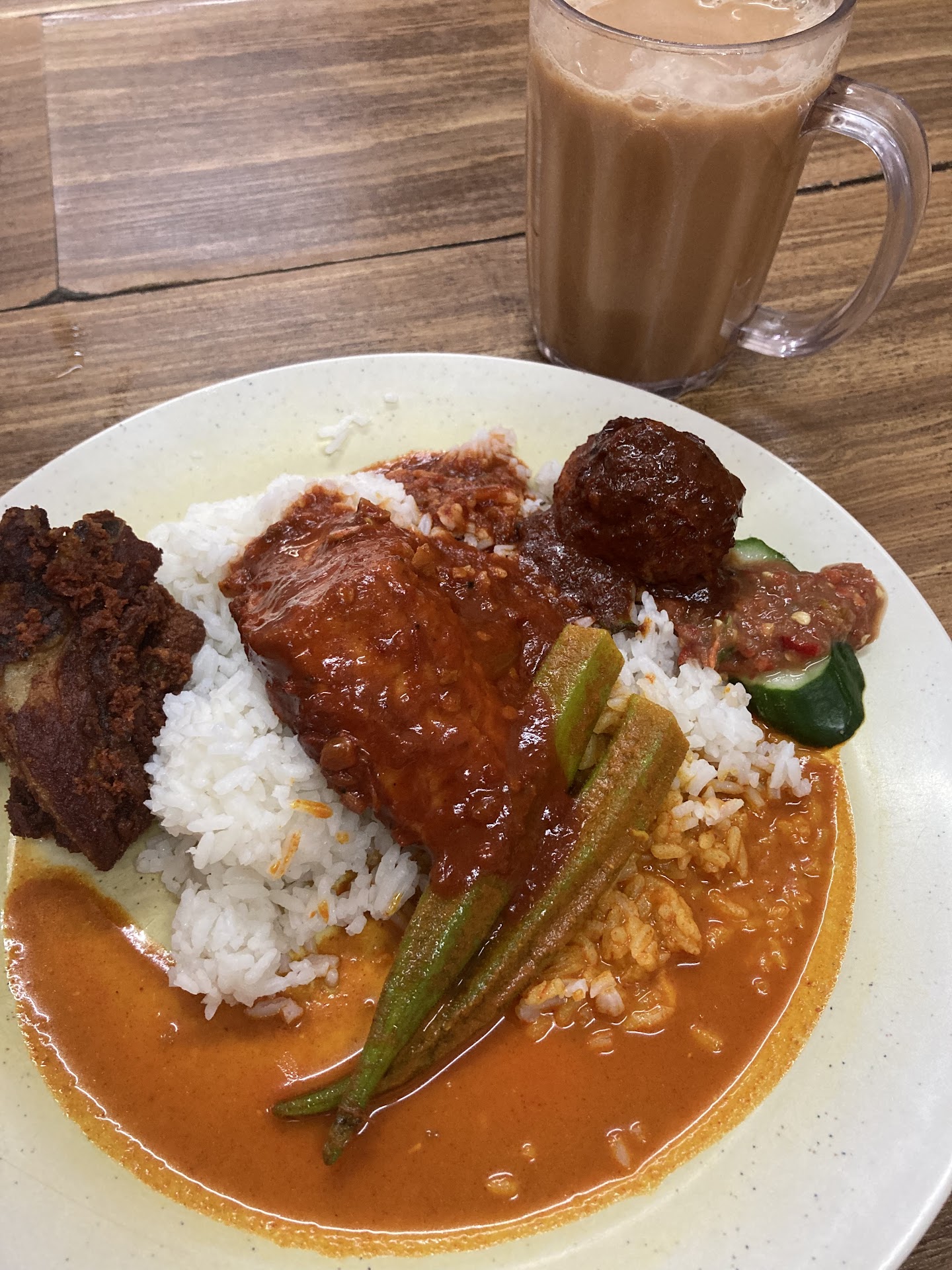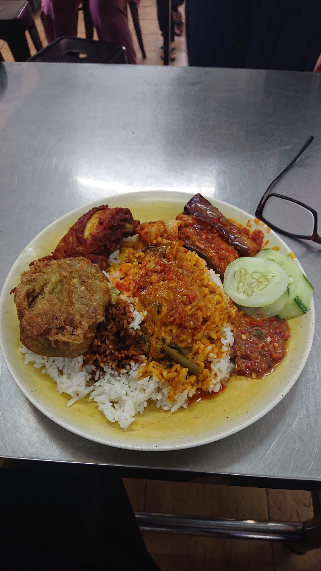 I had rice with fried chicken, begedil, chili aubergine, sambal belacan, cucumbers with some kuah added on top.
