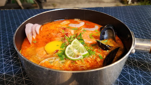 Go inside, most of the tables are located inside one of the house unit. It is fairly spacious and if you go in bigger group, you can just combine the table yourself. We ordered quite a lot of different type of food from the menu and safe to say they all taste pretty good! I ordered the green curry rice set and it comes with while chicken leg (thigh and drumstick) so I feel it is quite worth it. My family members ordered other food and they all said it taste good as well. The tomyam soup can be very spicy but they do ask you first how you want it to be and my kids love it. 😉 The rib is nice as well although I wish it has a bit more of that burnt smell.
