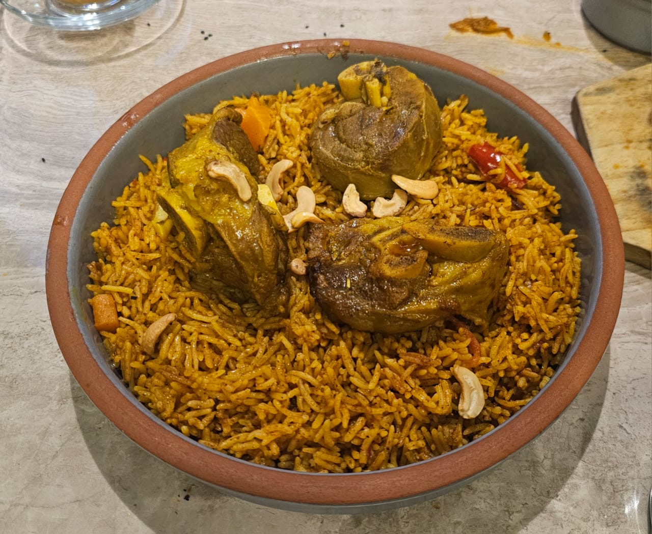 Now onto the food—everything we tried was delicious and clearly prepared with attention to detail. The lamb mandi was a standout: the meat was incredibly tender, well-marinated, and paired perfectly with the fragrant rice. It’s a dish that showcases the richness of Middle Eastern flavors without being overwhelming. We also ordered the salmon, and it was impressive not just in taste but also in size. For the price, the portion was generous, and the fish was perfectly cooked—moist on the inside with a nice outer sear.