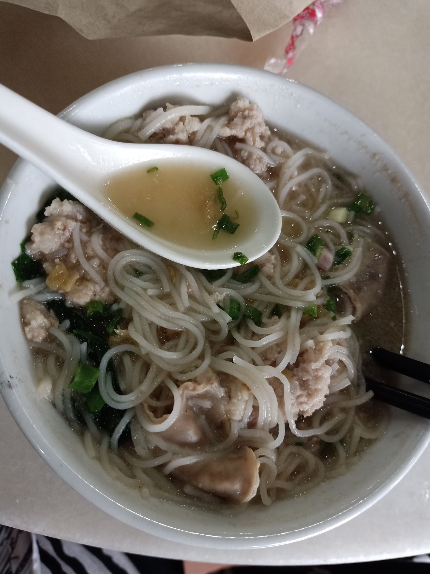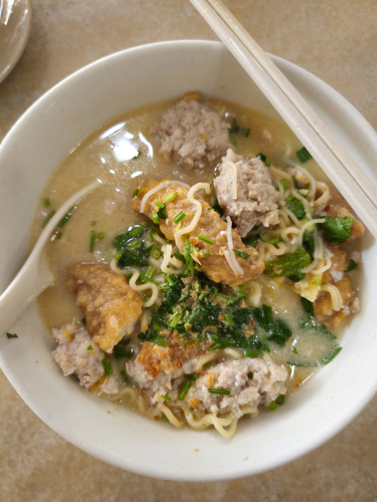 I have partaken of countless bowls of pork noodles in many places. None have come close to touching what this place has to offer. The soup is slightly milky with a clear and rich flavour. The amount of meat that they give is almost overwhelming, and the juiciness of it makes the mouth water. Each individual component of this work of art must first be tasted and enjoyed separately when the bowl arrives. Soup first, then noodles, then meat. And then, arrange in your spoon all the ingredients (at a ratio of 1/3 noodles and 2/3 meat) and immerse this with as much soup as you can. Gently place this as a whole in your mouth and close your eyes. Focus. On the swill of soup against the noodles and meat. On the blending of the separate flavours and textures. The bouncy and sweet, juicy meat intermingling with the snapping of a multitude of individual strands of noodles, accompanied all the while by the rich, caressing soup swirling all around. All this blends so that one becomes indistinguishable from the other. Soup becomes noodle, noodle is meat and meat was once soup. Swallow. Let the singularity be absorbed unto you. Know that pork gives not only nutrients and life, but also a reason for existence. Give thanks to pork. .... ... Other than that, the ambience is acceptably comfortable though when it gets really busy it's super crowded and cramped. Waiters seem a little distracted at best. It can get rather warm inside too. Ambience gets 3.18 stars. Service is 2.38 stars. Food, a solid 4.65 stars. If you fancy pork in any way at all, you need to make a pilgrimage here. Prices are damn reasonable too...