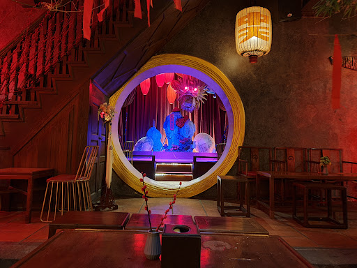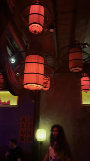 Chinese lanterns hang from the ceiling, casting a subdued red glow within each of the 2 large rooms. At the center of one room is the stage, adorned with red carpet, red velvet curtains, and asian stonework. From above, out of the ceiling, hangs an impressively large, red-eyed dragon, it’s open mouth ready to strike the young musician seated inches below.