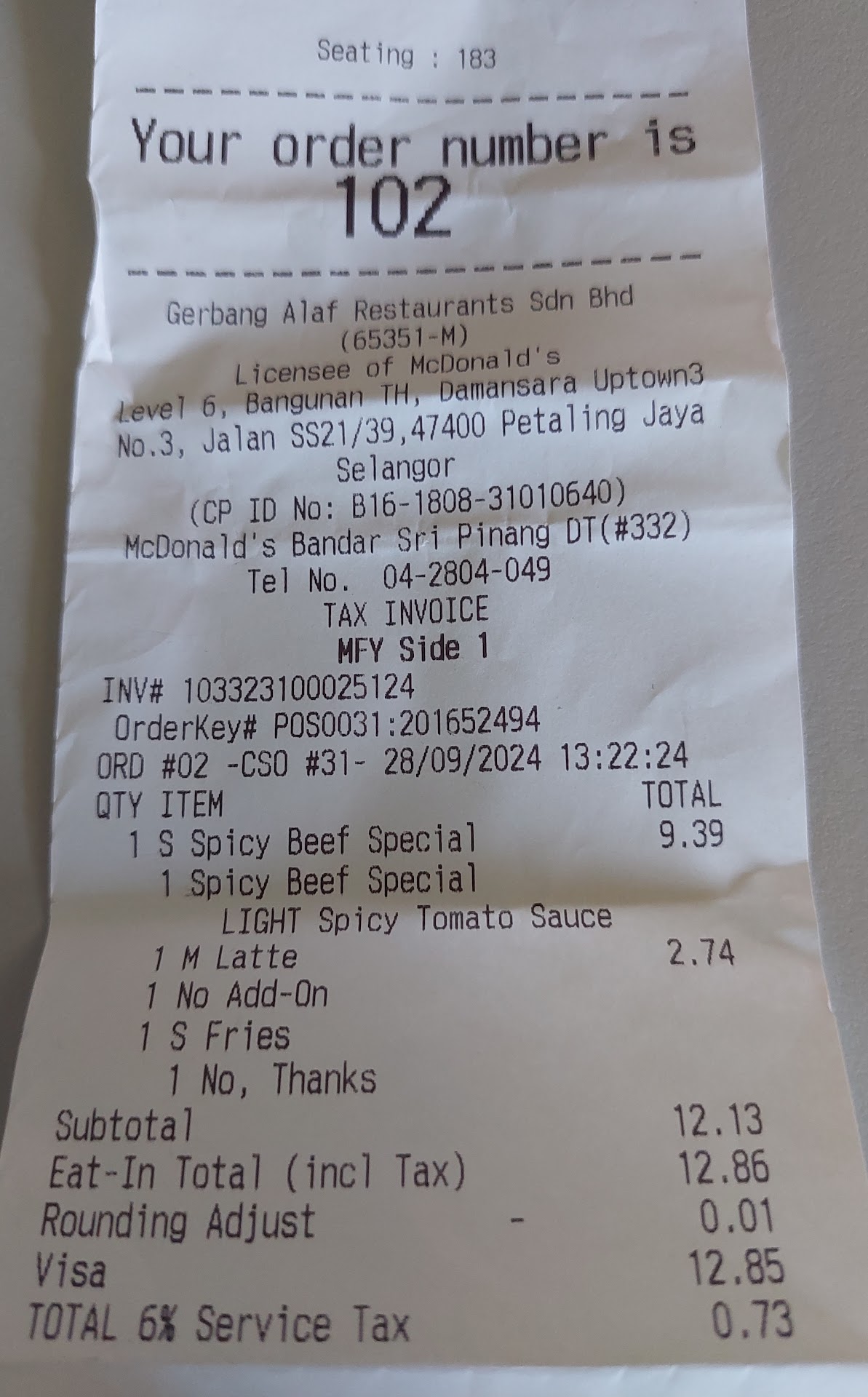 Read moreVery poor service. I ordered a set meal and changed my drink to latte, requested for table service. The staff delivery my set meal to me without my latte and said that for latte I have go collect myself at McCafe counter. What a ridiculous service for customer to request for table service to collect themselves, then what is the meaning of this "half" table service? Due to I'm alone to dine in and that time the restaurant almost full, I afraid that when I leave, my seat might be occupied and worst if the staff throw away my food. So I decided to finish my meal quickly then only go collect my latte to go. When I went to McCafe counter, no staff on duty, a few glasses of drinks were leave on the counter but none is hot latte. I tried call for the staffs and nobody want to attend for me. After I requested loudly to see the manager, only come over a lady but she said she is not manager, she just help for customer service. End up, she went inside the kitchen and bring me a glass of hot latte (not made from McCafe counter, then why not at first they service and send...