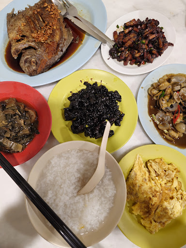 Read moreI have not been here for ages but decided to come for dinner since I had some cravings for teochew porridge. The highlights here are the dishes and I ordered the stir fried pork belly with chillies, pork in black sauce, fried black pomfret in soy sauce, clams, mui choi and eggs. In my opinion, the best ones were the fried pomfret and stir fried pork belly. The pomfret was fried to a crisp without overcooking the meat and the pork belly was delightfully savoury. All the dishes here were prepared with stronger taste which are typical of teochew cooking but they went well with the plain watery porridge as it balanced out the differences in intensities. Do be aware that the stronger flavor profile may be too salty for some people. The prices were higher than average but I suppose the good taste made up for that. I'd recommend this place for those looking for a good teochew...