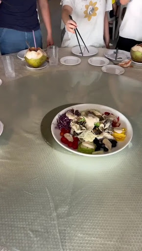 Japan Salad ( yee sang) - a vibrant, festive toss of prosperity.The roasted sesame mayonnaise blend of dressing ties the fruits and vegetables together smoothing out the contrasting flavours into a harmonious blend with nutty notes and a creamy finish. Succulent fried meatballs with brinjal - golden and crispy. Tenderly boiled baby octopus, prepared for dipping in sweet chilli sauce. 4 sar hor fun - a silky, savory noodle delightfully , fried evoking the distinct â wok hei â Steamed lala - each bite brimming with the oceanâs essence. Two variations of chili crabsâone laced with velvety egg, the other in its pure, unadorned glory. Clay pot steamed fish in soy sauce, its delicate flavors gently wafting through the steam. Deep-fried tofu, a crisp exterior yielding to a soft, pillowy heart. Fried bitter gourd with eggs, a harmonious blend of textures and tastes. Sweet and sour pork, ingeniously immersed in ice, offering a refreshing contrast.