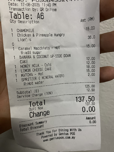 Read moreI joined member and came for lunch with family. We ordered below dishes, 1.Chicken & Pineapple Pizza (Only 1 size, Large,we wanted to order medium but it's not available. Cheese portion was wnough but the Chicken slices was too little ans so thin till barely can taste it. Pineapple slices was too small) 2.Mushroom Soup (It's thick and flavourful but too salty) 3.Grilled Salmon (This was good but Salmon was too salty, Mashed Potato was not enough) 4.Smoked Duck Aglio Olio Pasta (This was ok but smoked duck and pasta portion too little) 5.Grilled Chicken Basil Pasta (The grilled chicken portion was good but too salty and grilled too long till very hard, pasta portion was little, quite oily and dry. If some cream is added then it'll be better) 6.Salmon Cabonara Pasta (Asked to Steam or Grill the Salmon as I didn't want to eat Fried Salmon but got rejected, but Chef agreed to boli the egg instead of adding it raw. Salmon was too salty, pasta was little but tasted good) 7.Tried the Chocolate and Cheese Cake and it's good but too sweet. Recommended things to improve 1.To provide small/medium/large size selection for pizza. 2.To reduce saltiness of all food or as per customer request as not all customers can eat very salty food. But the Chicken or Salmon might marinated earlier already. 3.To increase pasta portion as the price was high 4.To be willing to cater to customers request like Steam or grill the Chicken or fish if customers don't want to eat Fried food To reduce sugar level of cakes, better for customers' health and save cost too 6.We had to wait long to ask questions as only 1-2 staff were kind of in charge person which can answer but they were too busy preparing beverages or doing payments while others can't answer, please see how to improve this.