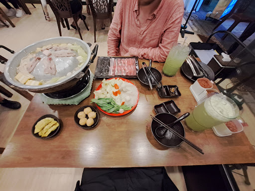 This is a charcoal mookata eatery. Came here after hearing such good reviews. I came here with my partner and we ordered the set A and C of the menu which comes with a plate of mixed vegetables, some glass noodles, meat balls as well as a plate of sliced pork for bbq. Set C is like the cooked meat, consist of the signature pork bbq skewers, taiwanese sausage, chicken wings and some fried luncheon meat. Ingredients are fresh, the pork has no porky smell which is good. I was just wondering if the glass noodles can be changed to some other types of noodles.. I wasn't a big fan of glass noodles. I want to give credit to the bbq chicken wings and the pork skewer. The chicken wings are very tender, the meat literally falls off its bone. The marinate is very good. I absolutely love their chilly. From the mild one to the max spiciness. They are all very good. Flavourful and aromatic.