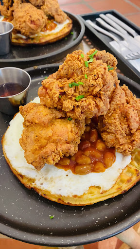 Menu: An extensive menu with both food and drinks. Plenty to choose from. We ordered a Bling Empire coffee (espresso, orange juice, honey, and club soda), an iced coconut latte (espresso, coconut cream, and a hint of condensed milk), and to eat, we ordered the chicken and waffles (chicken karaage, baked beans, sunny side up eggs, and maple mustard syrup). Everything came out in a timely manner, with the drinks preceding the food by an appropriate margin, giving us time to settle in and enjoy the ambience and our coffees. The food came later and was honestly big enough to share. We ended up taking some home. It presented well and tasted better than any other that we’ve had in Southeast Asia.