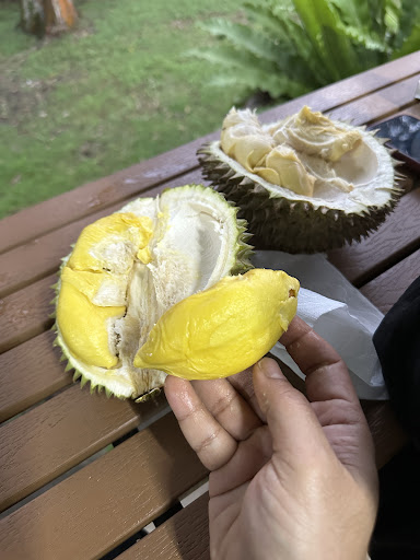 It feels very peaceful and relaxing, a nice change from crowded city durian spots. You can really enjoy your durian in the shade, fresh air, and under the canopy of real durian trees — a rare and authentic experience.
