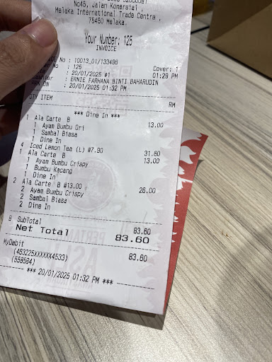 I queued for over 20 minutes, only to be informed at the counter that there was no spicy ayam available — only original — and even that was limited to dada part only. Why wasn't this informed earlier while we were still queuing? It’s frustrating to waste time only to find out that the main item your brand is known for isn't even being served.