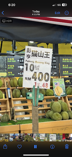 We tried Kunyit and Mao Shan Wang durians from Pahang — rich, creamy, and full of flavor. We spent around RM400 for two durians. Not sure if that's considered reasonable in JB, but we were happy with the quality.