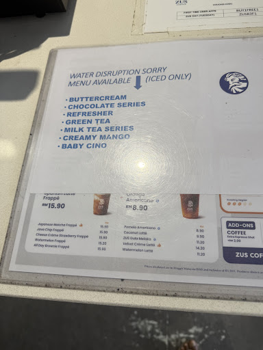 I visited the Zus Coffee outlet at Gelang Patah on 24/5 at around 3:50 PM. To my surprise, I was informed that they didn’t have coffee available at the time. It felt quite strange ,a coffee shop without coffee. I was told that only 6 menu items were available, which seemed very limited and unusual.