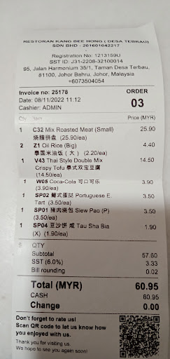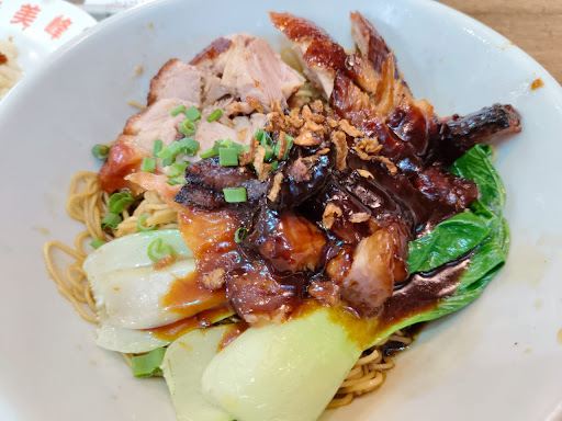 We ordered R11 - 2 mix roasted meat rice with chicken thigh and honey char siew lean meat. Super delicious! One of the best chicken rice in JB town. You won't regret and won't go wrong with their chicken rice series . Dining in is better than take away as I had tried "tapao" thereafter and seems the char siew portion is disappointing. Also ordered N03 Herbal Roasted duck noodle with char siew added. Duck meat is really tender (because some duck meat hard to bite off) and no 'ducky' odor. The kolo mee noodle is also springy and much dark soy sauce gravy which i like.