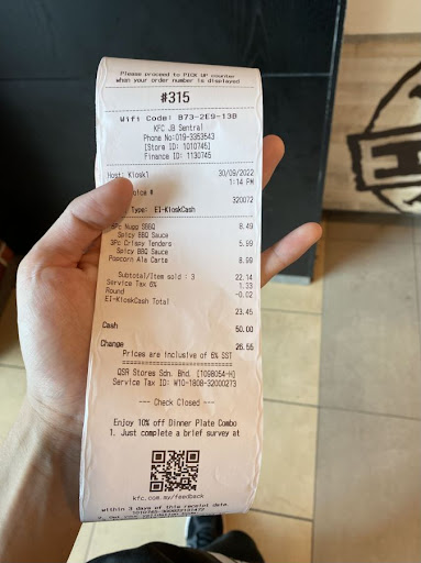Read moreCashier was rude and when ask for help from the KIOSK machine staff take their own sweet time and made everyone wait for it , end up both KIOSK machine was not working , they don’t accept ordering at cash register which is very weird. The only way to order is through the KIOSK machine. Wait for a good 20mins to order as the machine kept having error and at the point of time only one of the machine is working and what is worst is when it is our turn to order at the KIOSK machine was not working LOL and end up both machine was not working in the end made everyone queuing up frustrated customers was asking for help for the KIOSK machine , all of the staff just stand inside and ignore the customer’s request worst customer service ever. we ended up not eating at KFC and wasted a good 30mins there. FYI staff was completely aware that the KIOSK machine was not working and did not come and assist us and instead they just stand inside the store and stare at us when as for help , they took their own sweet time coming...