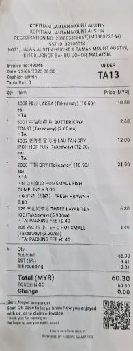 Read moreIf you want innovation and variety in your food, you can't go wrong here. Ordered laksa and even pointed to the thin Bee hoon for emphasis, just in case the malay lady can't understand, I got laksa laosu fen. Interesting Then I also ordered ipoh hor fun. Didn't know Sg n My ipoh hor fun is so different. So My version is actually fish ball noodle? I am so educated. Actually there is something that is same with Sg here. The price. Definitely can match Sg price, cup so small that the receipt is bigger yet cos me rm3.60. I can't say much for the rest of the food, cos I too full from drinking water to quench thirst, maybe its cos of the salty food. P.s. the food is takeaway so I shall rate the atmosphere 3stars, cos the restoran looked nice, with air con and all - looked cosy enough for the 10 people eating there on a...