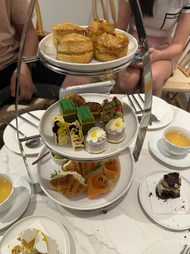 The high tea tray was a visual treatâbeautifully arranged truffle egg mayo croissant, warm scones with clotted cream and jam, and an impressive array of miniature pastries that looked almost too good to eat.